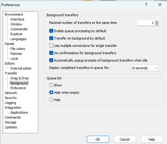 Click the `Options`and then `Preferences` menu in WinsCP. In the poped up window, click `Transfer` and then `Background` to (Figure 1)
