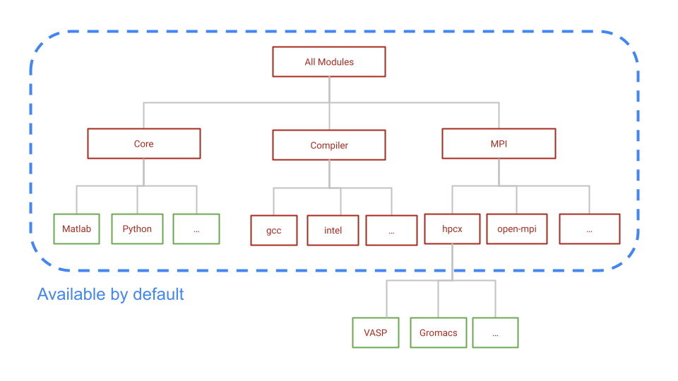 As shown in the schematic, Core, compiler and mpi modules are available by default. You can see the list of these modules by running the command module avail